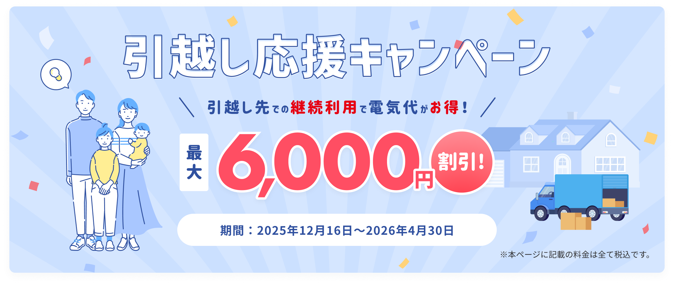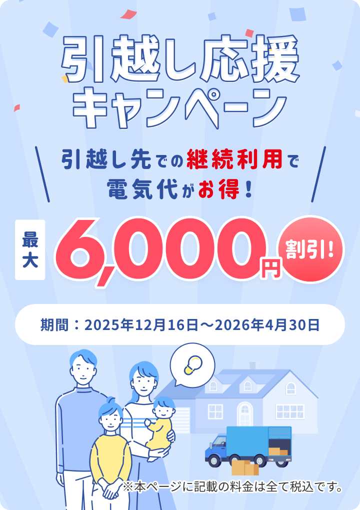 - 本キャンペーンは、お申し込み時点で当社と電気のご契約があるお客様であり、転居の際、他の電力会社とご契約されることなく、引き続き当社とのご契約を継続いただけるお客様を対象としております。